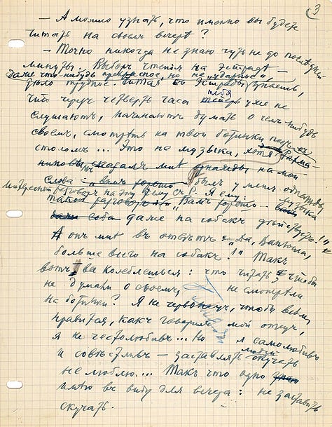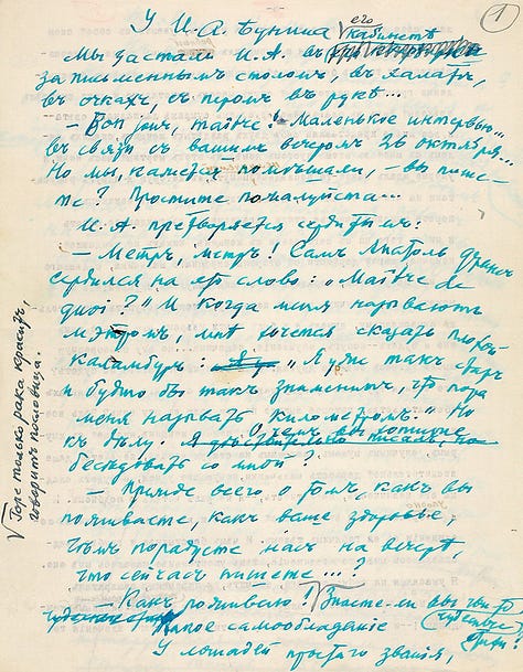 Nas imagens a seguir, podemos encontrar parte do original de contos da obra “Alamedas escuras”. Porém, ainda mais curioso é que, na parte de trás de cada página, encontramos o manuscrito do que seria uma entrevista com Ivan Bunin. Esta entrevista deveria ser feita no dia 26 de outubro de 1947, em Paris, antes de uma noite literária, em que Ivan Bunin leria suas memórias para um grande público. No entanto, Bunin resolveu ele mesmo escrever as perguntas e suas respostas. Segundo dizem, para um dos organizadores, que era um conhecido dele. O texto foi escrito como se Bunin estivesse conversando com um jornalista.