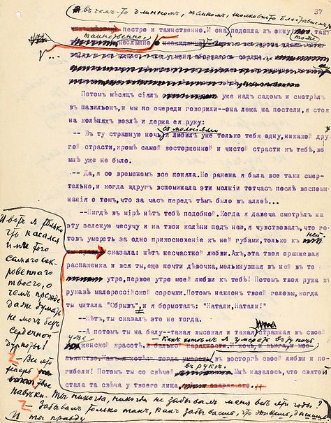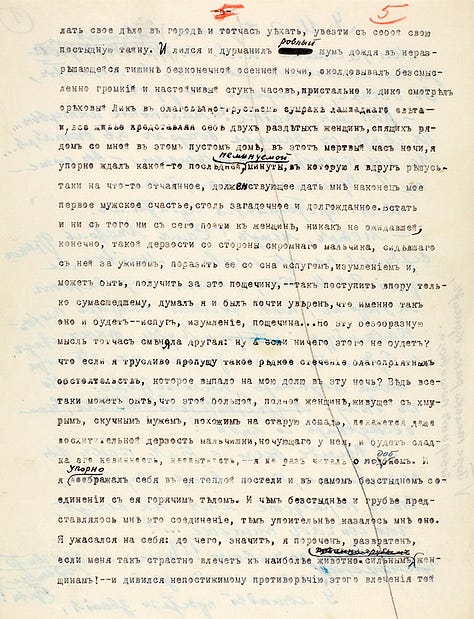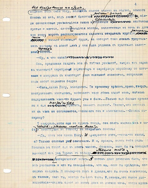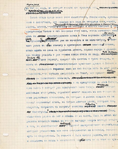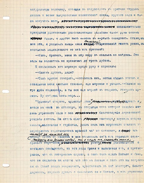 Ivan Bunin era um autor rigoroso com suas obras e igualmente rigoroso como leitor das obras dos seus colegas e até mesmo de amigos. Em seus arquivos de originais, não é raro encontrar manuscritos ou textos datilografados com inúmeras marcações e correções do próprio autor; ele fazia isso até a exaustão. Com seu original de trechos de contos de sua obra “Alamedas escuras” não foi diferente: sobre o texto original datilografado, Bunin rabiscou e corrigiu diversos trechos.