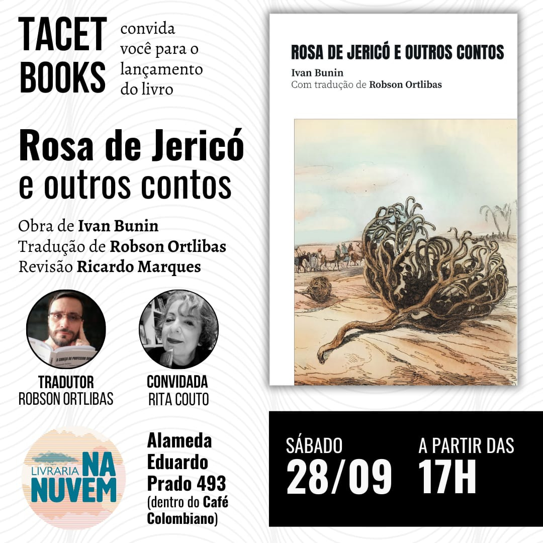 O texto “Conversa com I. A. Bunin”, bem como outros seis contos da obra “Alamedas escuras” e mais 7 contos inéditos no Brasil, fazem parte do livro “Rosa de Jericó e outros contos”, de Ivan Bunin, com tradução direta do russo por Robson Ortlibas, lançado pela Tacet Books . Está à venda na Amazon de todo o mundo, em formato digital e impresso. Haverá dois eventos de lançamento, o primeiro online, no canal da Tacet Books no YouTube, dia 26 de setembro, às 19h; o segundo será presencial, no dia 28 de setembro, a partir das 17h, na livraria Na Nuvem, na Alameda Eduardo Prado, 493 (dentro do Café Colombiano), em São Paulo.